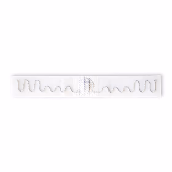 ICチップを樹脂で固めたモジュールはアンテナループ中に配置保護。ICチップとアンテナとが接続されておらず強い衝撃を受けても断線の心配なし。工業洗濯200回を保証し、60バールの加圧脱水をクリア、200℃のアイロン耐熱性、オートクレーブ対応。