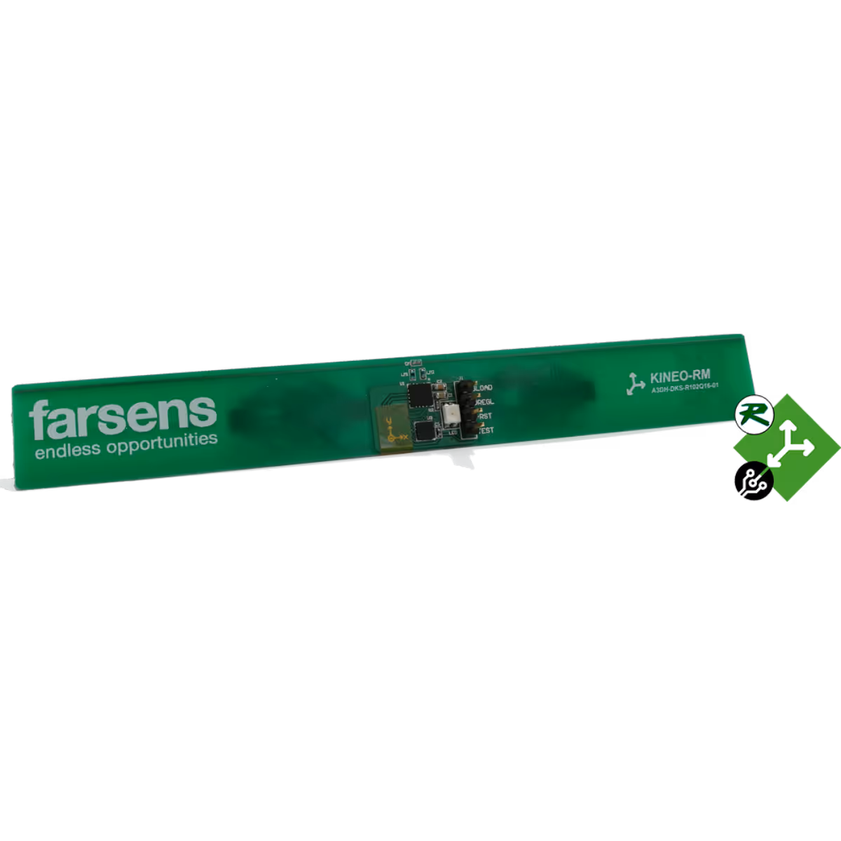 EVAL01-Kineo-RMはEPC C1G2/ISO 18000-6C準拠のバッテリーフリー3軸加速度センサータグです。±4gレンジ、±40mg精度、2mg分解能。受動5m・BAP15m・EBAP20mで通信。User 0x100で各軸データ取得、User 0x91でLED点滅をトリガ可能です。
