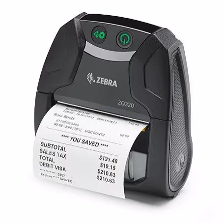 Zebra ZQ320は、130×117.7×49.5mm・0.43kgの3インチモバイルプリンタです。感熱式203dpi、最大4ips。2280mAh PowerPrecision+バッテリで長時間稼働。Bluetooth 4.2/802.11ac対応。IP54、1.5m落下耐性。屋内外モデル対応。Link-OS/Print DNA搭載。1年保証。小売・配送に最適。