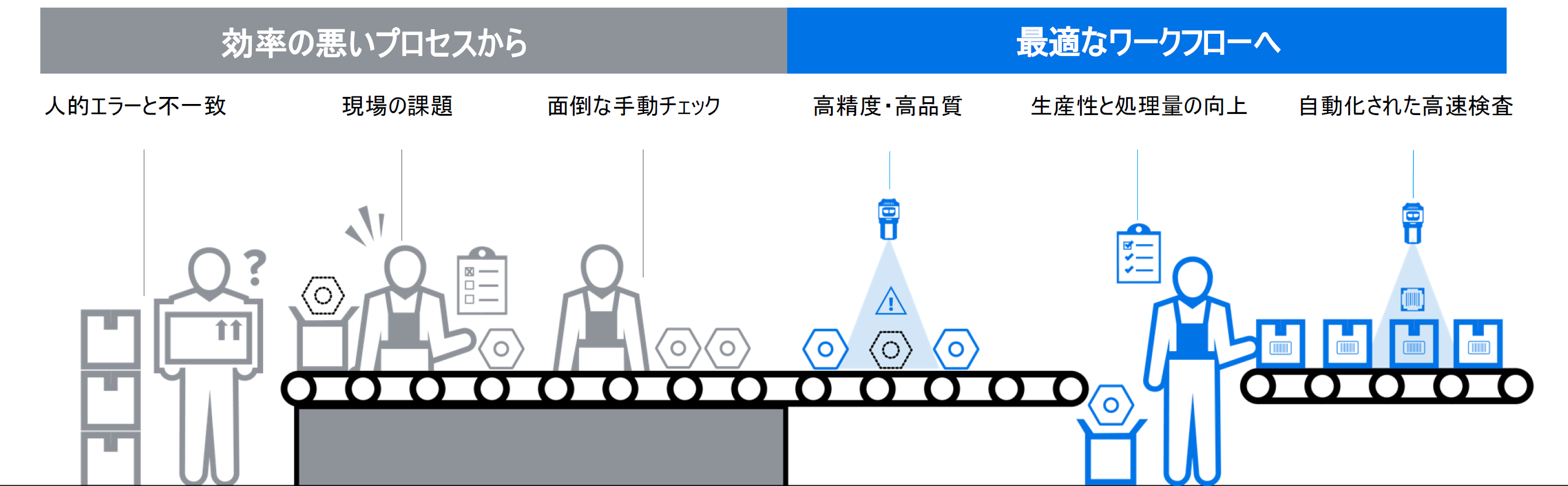 Aurora Software™は、マシンビジョンと固定型スキャナの業務を統合するためのソリューションです。このソフトウェアは以下の特長を持ち、あらゆる業界での効率化を支援します。